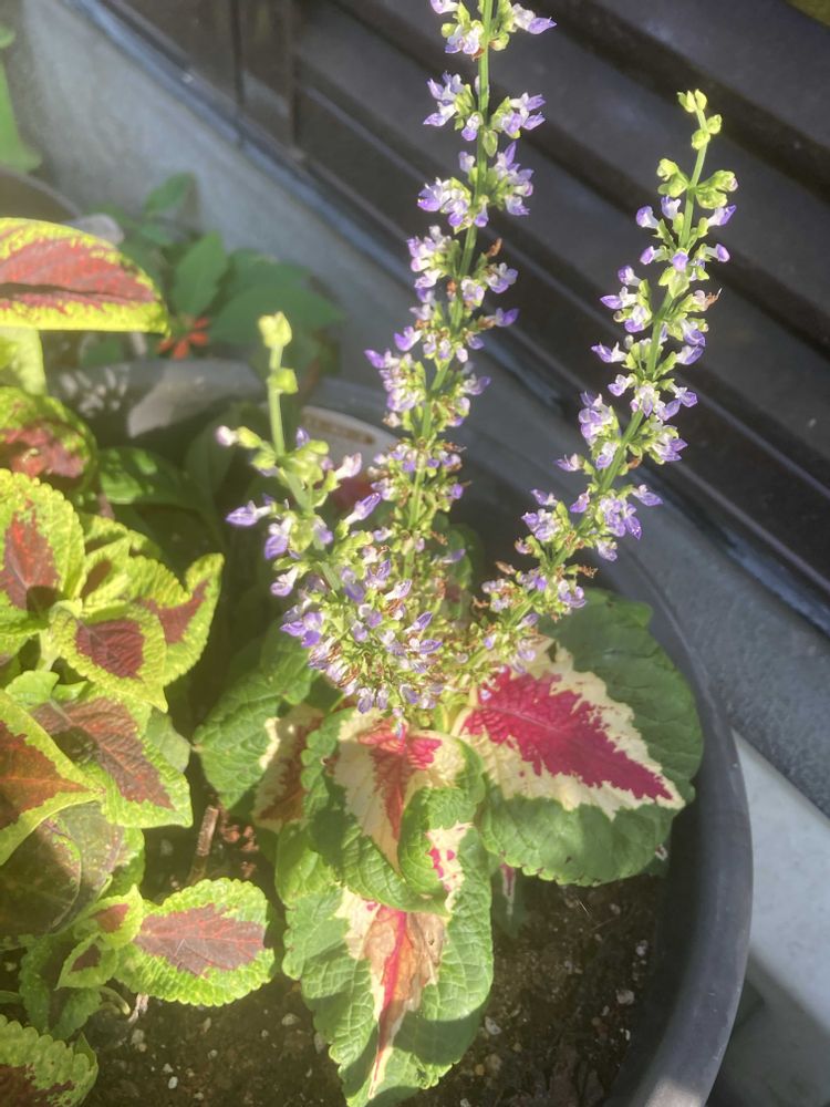 コリウスの薄紫の花、ケイトウ,ユーホルビアも、いいですね😄