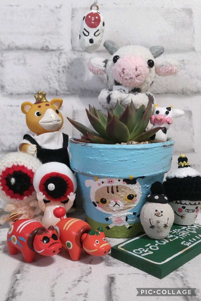 1枚目は、牛の日にみんなが集まっています。なかなか登場出来ないインスタでGETした鬼っちと、apple appleさんに頂いたハグちゃん💕白黒なので、牛の日に紛れて🥰✌️
