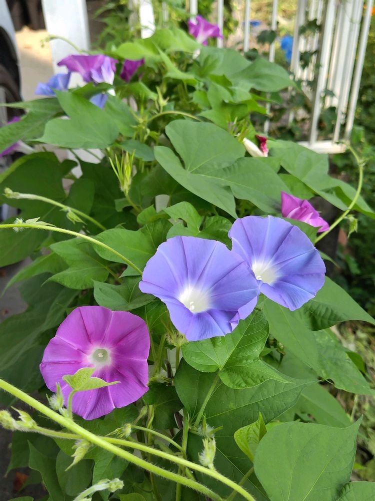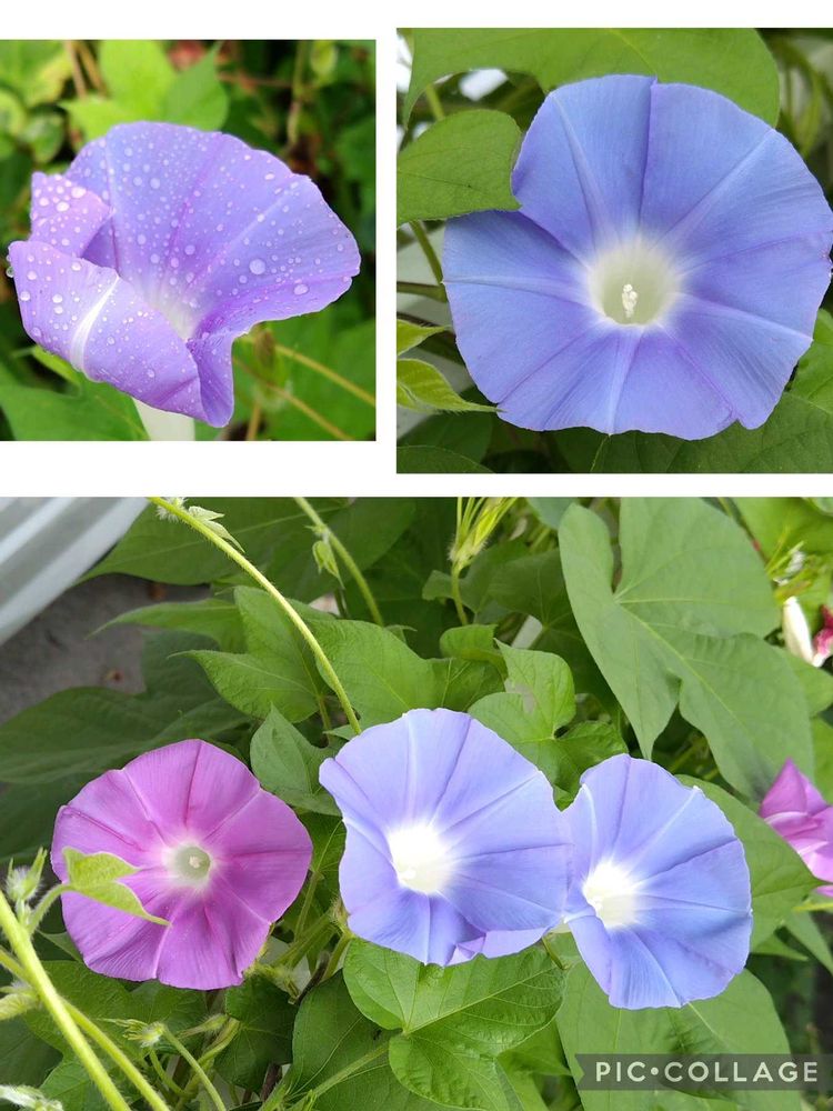 こぼれ種の朝顔が庭や畑で乱れ咲いています😅