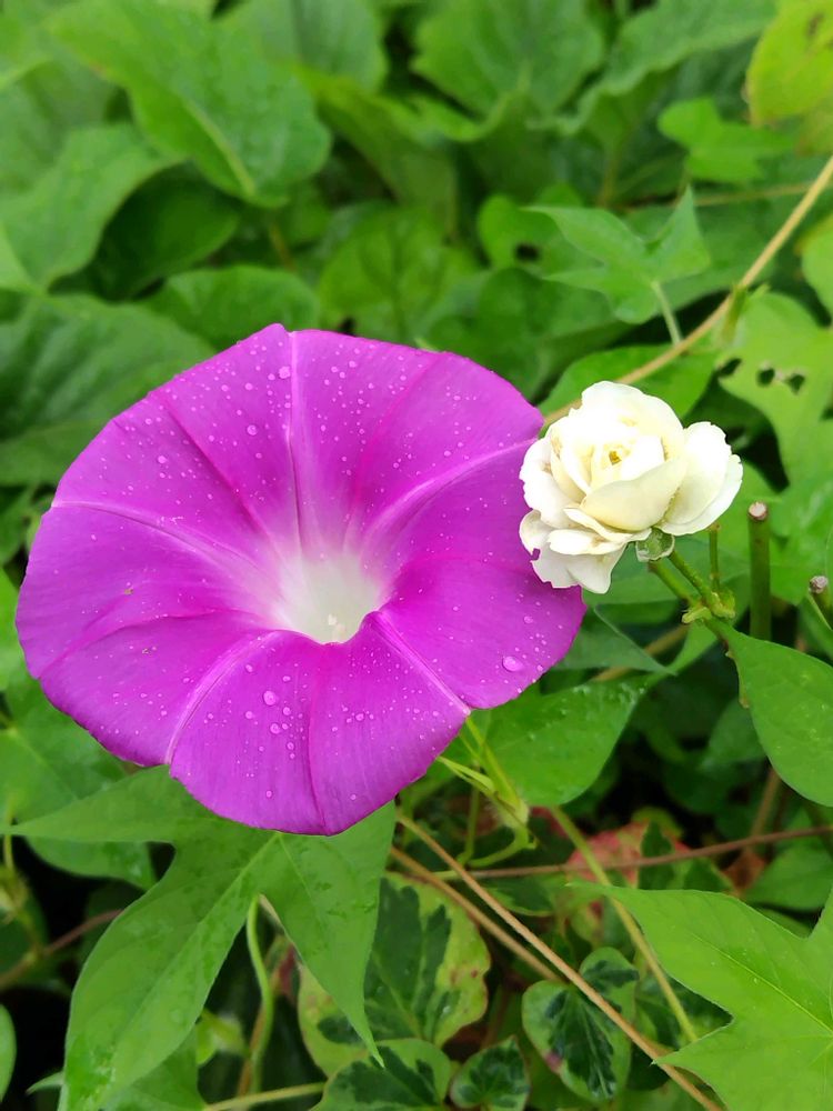 ③鉢植えのバラに巻き付いて寄り添って咲いています🤍💗④畑の花桃の木に巻き付いて咲いている朝顔💙
