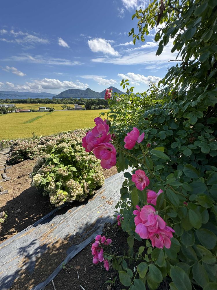 昨年まで高台にあった広大なひまわり畑がお花のガーデンに変身。紫陽花、マリーゴールド、薔薇などいろんな種類のお花たち。高台から見下ろす田んぼの色が眩しい。美味しいお米たくさん育ってね😊