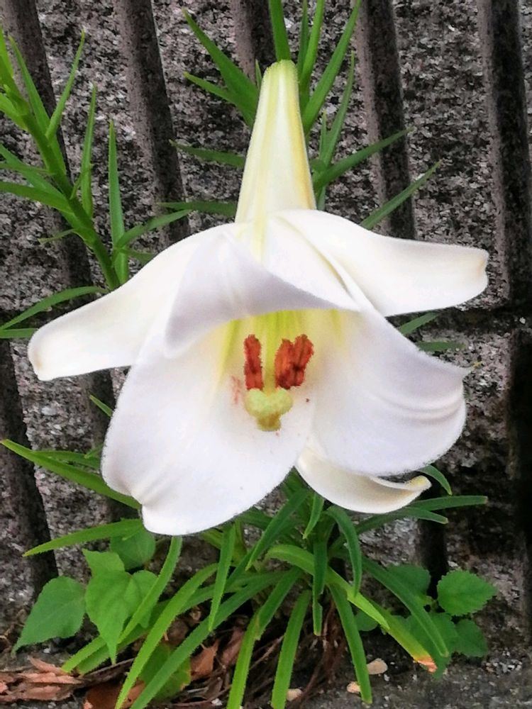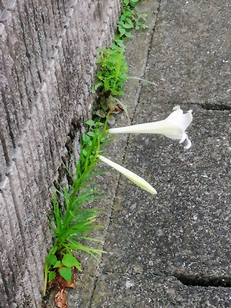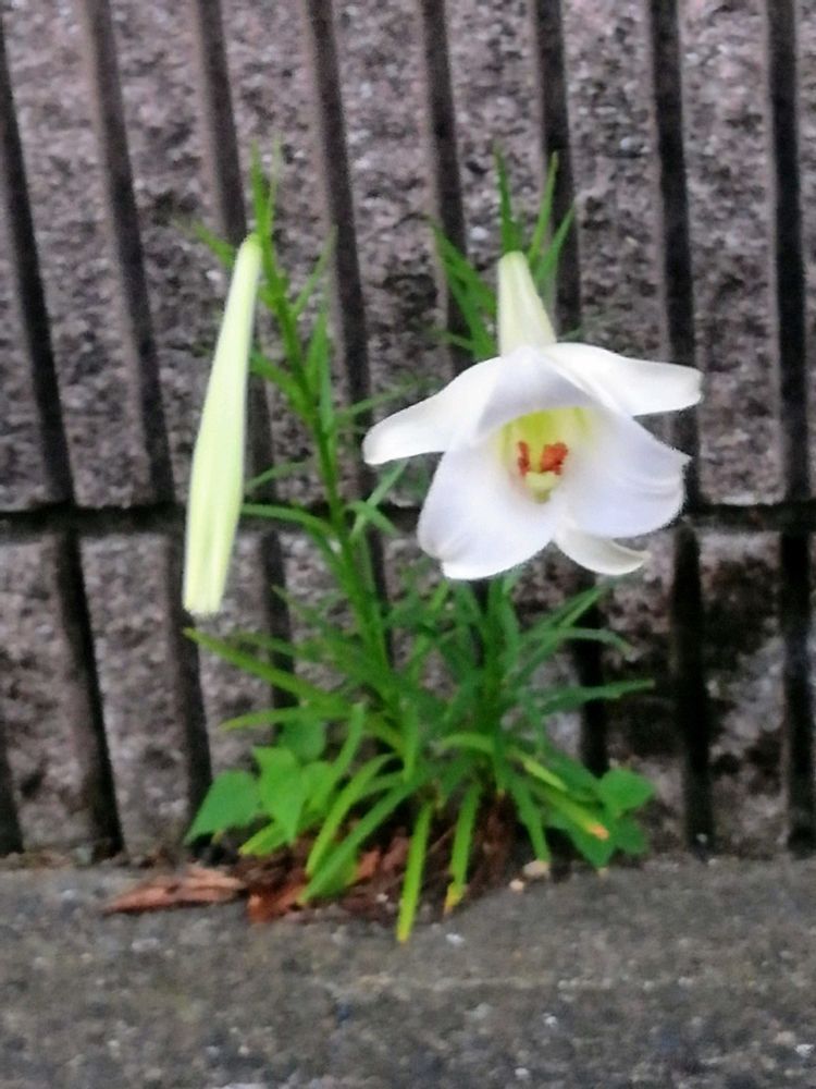 ブロック塀と側溝の隙間に生えれる成育旺盛なユリです😅