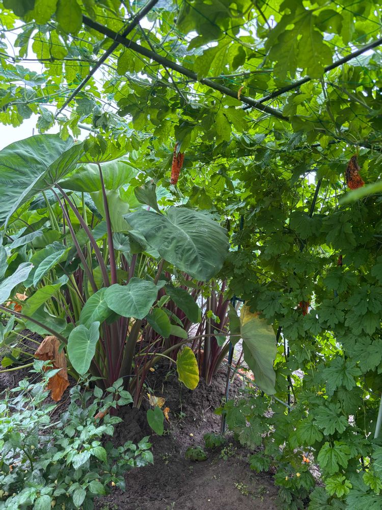 ゴーヤの横に植えてた里芋がめちゃくちゃ大きくなってゴーヤの屋根まで届いてジャングルのよう🌿