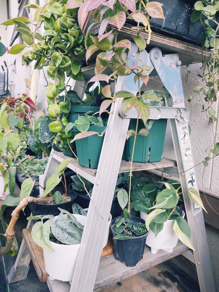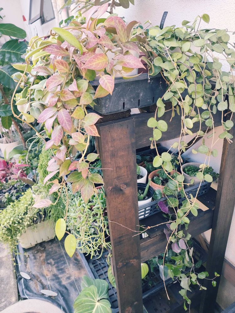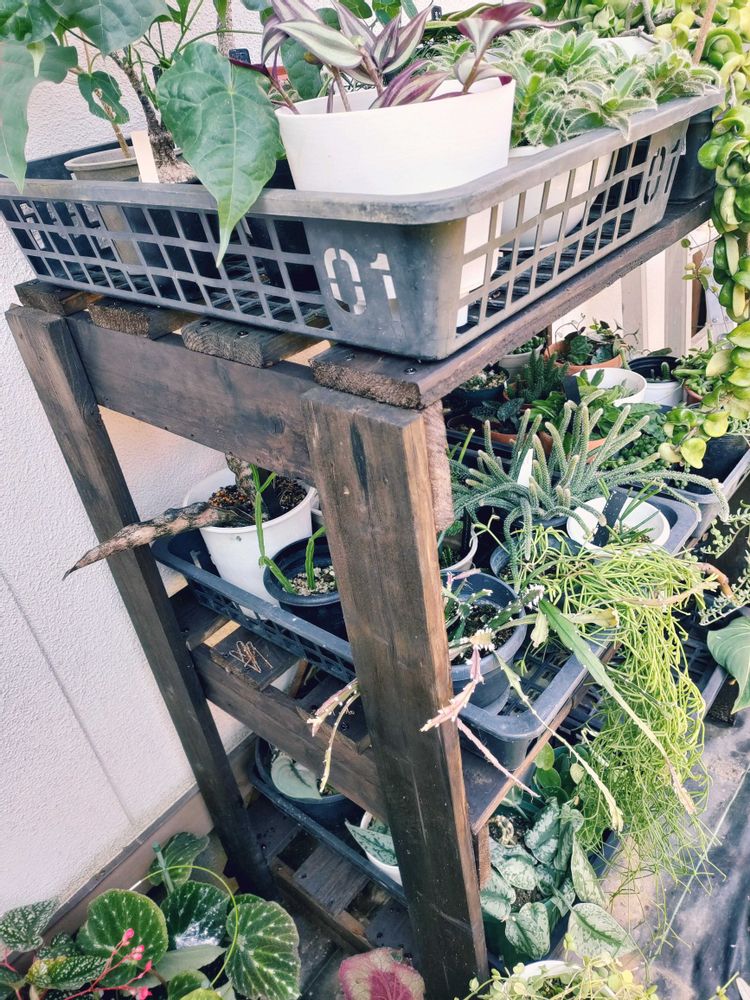 屋外管理しているグリーンは家にあるものを駆使して並べていたのですが、脚立は使えないと困ると相方から苦言が(3枚め)💦代わりに断捨離対象だった1×4の廃材で棚を作ってもらいました✨脚立より格段に収納力🆙捨てようと思っていたものが再利用できてお互い満足です☺️