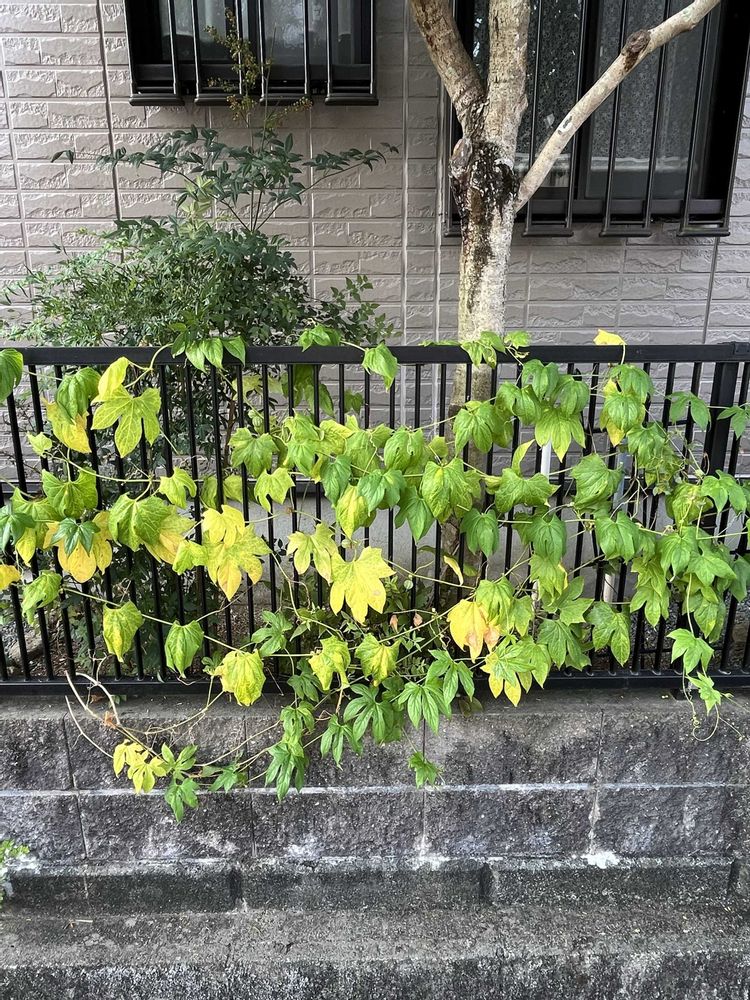 ②オキナワスズメウリも、葉が黄色くなって今日の姿です😢実が付いてるには付いてるけど。
