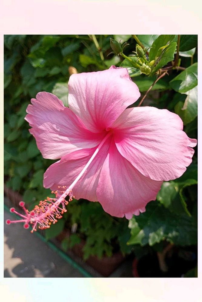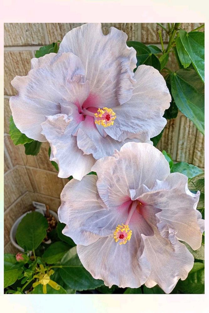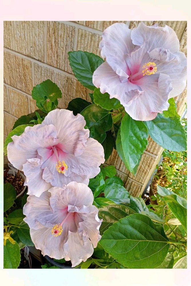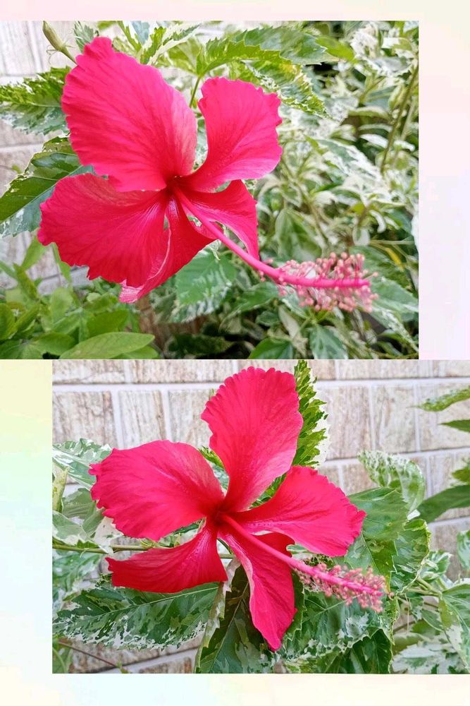 ✤斑入り葉🌿のハイビスカス🌺「スノーフレーク」がやっと伸びやかに咲きだしました😊(先に2,3輪が咲きましたが花弁先がくるりん💮💦してたりと…) 今日はご機嫌のよう👌
