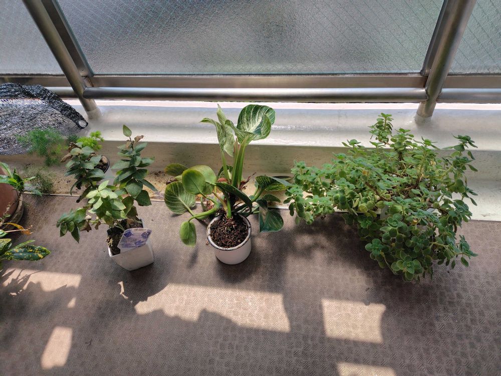 夏はベランダ組(フィロデンドロン・バーキンさん👜とアロマティカスさん)をベランダのすりガラスの陰に入れてみたら、日光がいい感じに弱められています。