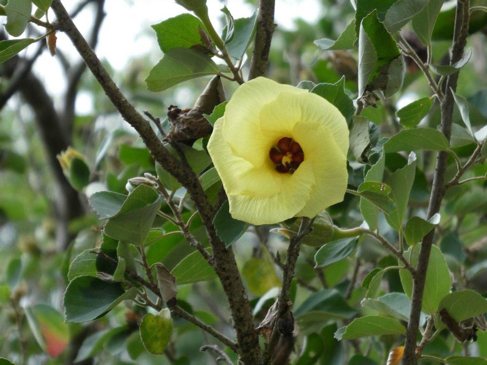 関東ではあまり見ない花で、牧野植物園で出会いました。オクラの花に似ている気がしましたが、樹木の花です。