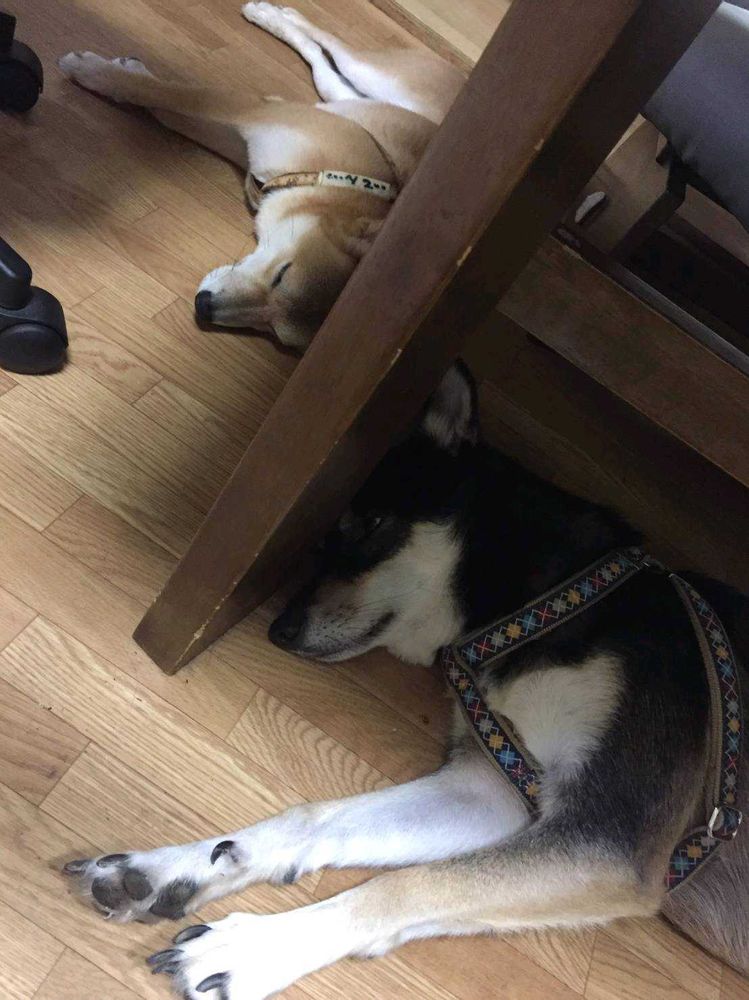テーブルの脚板を挟んでお昼寝💤まだ若いよ🐶🐶数年前のpicです