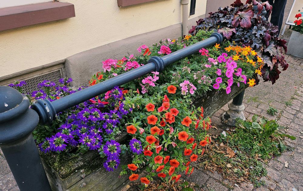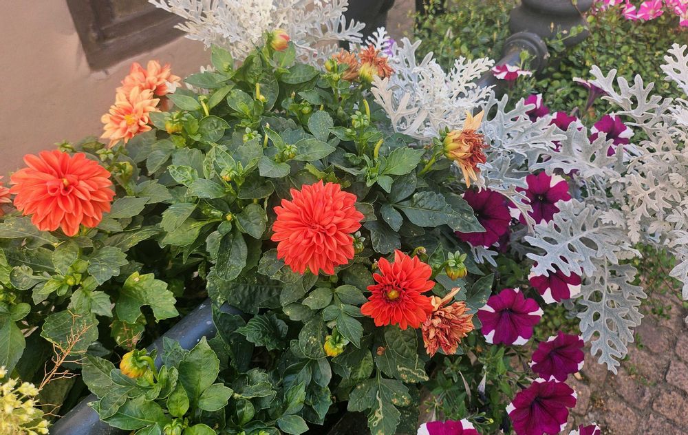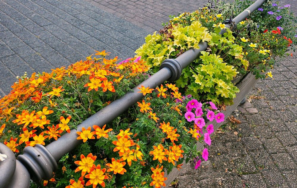 小さな車道脇の洒落た柵にきれいな寄せ植えが、あちこちに飾られていました🤗