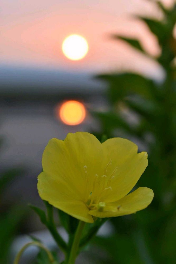 朝焼けと朝日のリフレクションと、しぼむ前の待宵草とのコラボが上手く撮れました✨✨🌅