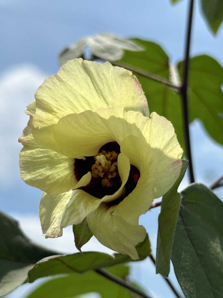 オクラの花にも似てる美しい花その後1ヶ月ぐらいで果実が割れ可愛いコットンボールを見る事が出来ます