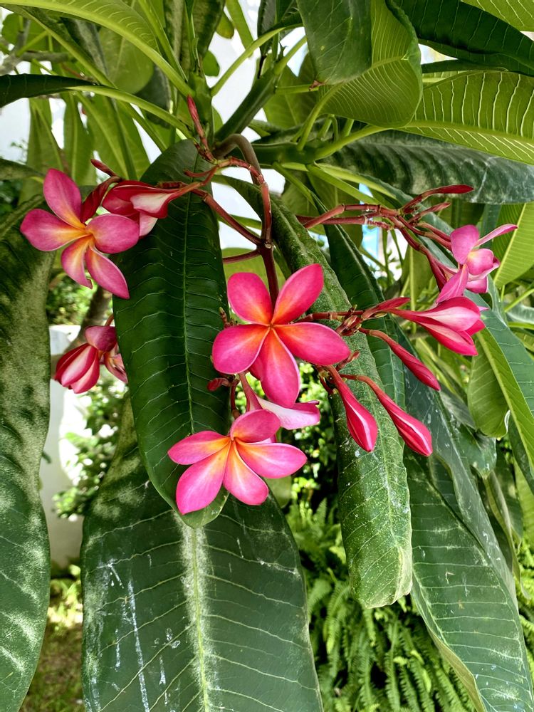 昨日〜所用で訪れたホテルの花壇で鮮やかなピンク色のプルメリア💕が咲いていました〰️🩷💛😍美しさにうっとりでしたね😍