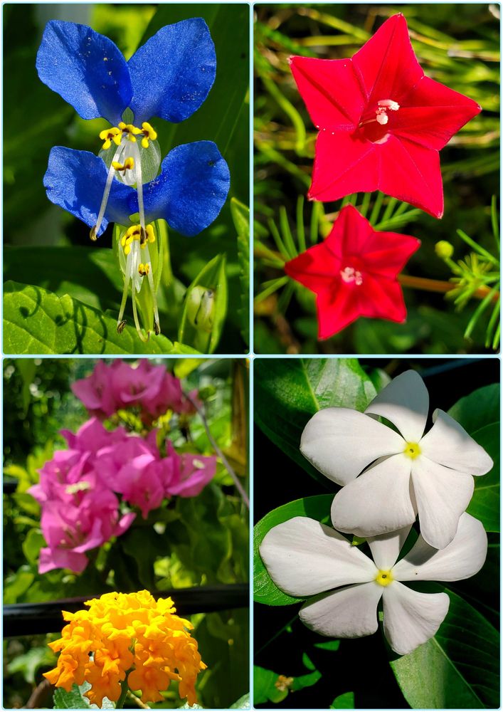 1️⃣左上から時計回りで、ツユクサ ホソバルコウソウ ニチニチソウ(白) ランタナ(黄色)とブーゲンビリア