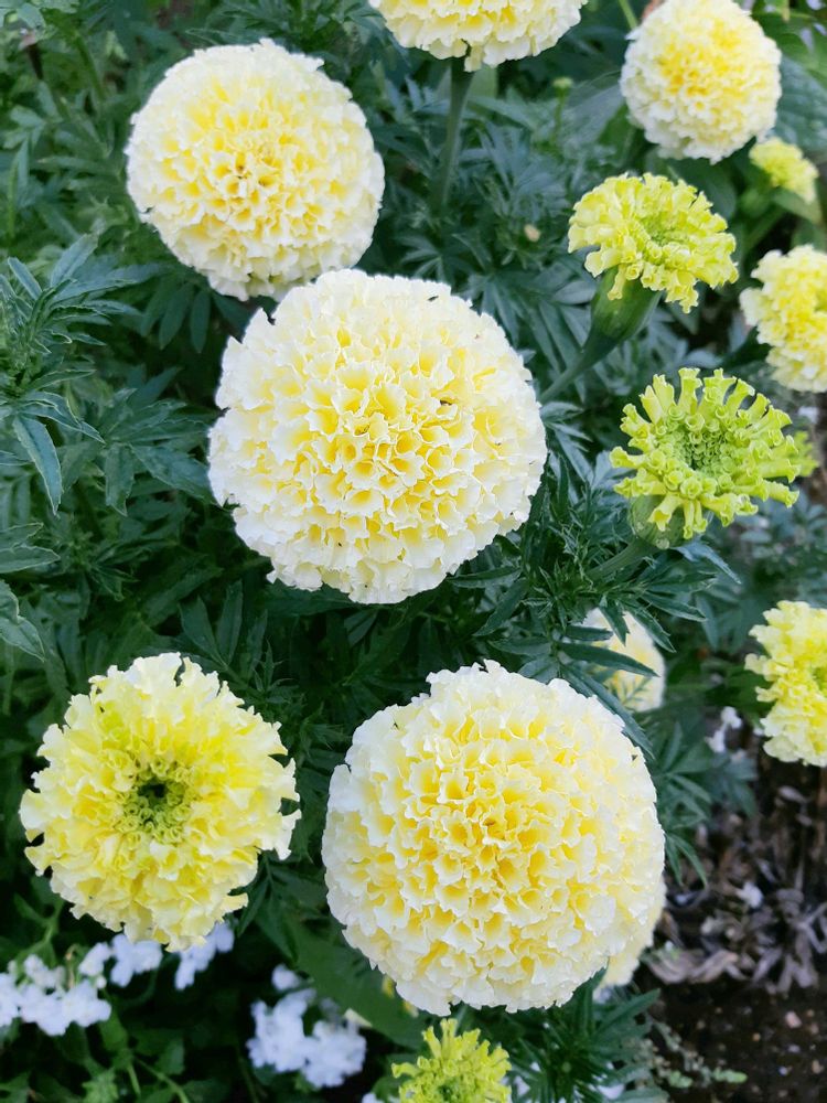 ①この夏、庭で大活躍してくれている白いマリーゴールド、アフリカンホワイトゴールドマックス🌻レモンがかったクリーム色の大ぶりな花です🍋