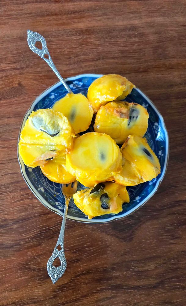 熟成完了!、いただきまーす!!、独特の風味、ネットリとした食感ポポー、長崎の友に感謝、もうひとつ大好きな風景余市とのコラボで!!!。