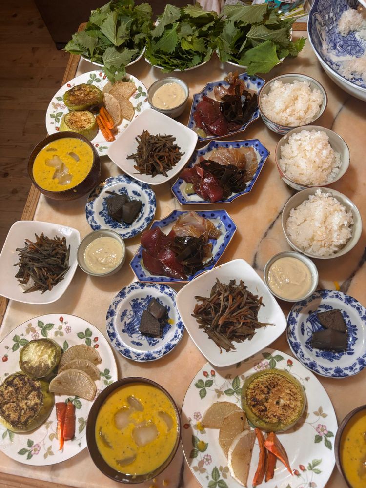 所狭しと並べられたご馳走、「これはぬたで こっちは大根煮かな」「こちらはカボチャ味噌ポタージュね」と、タグと照らし合わせるのが楽しい食卓です♪