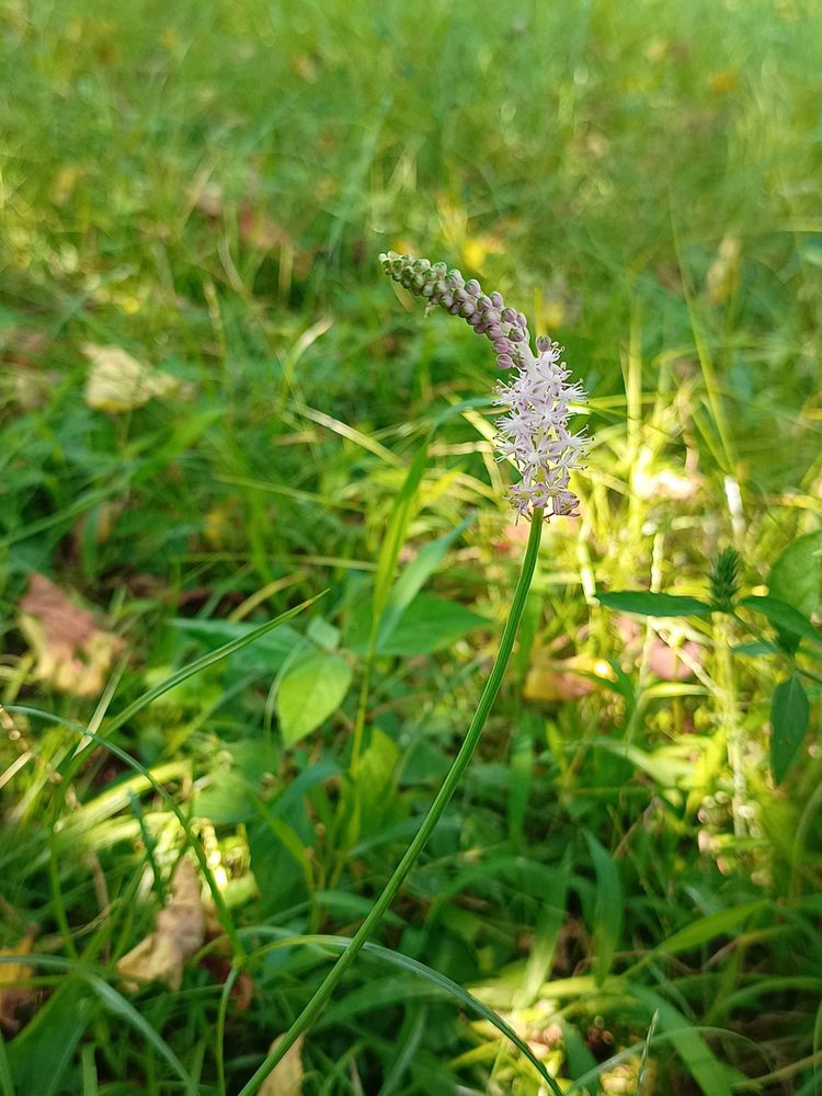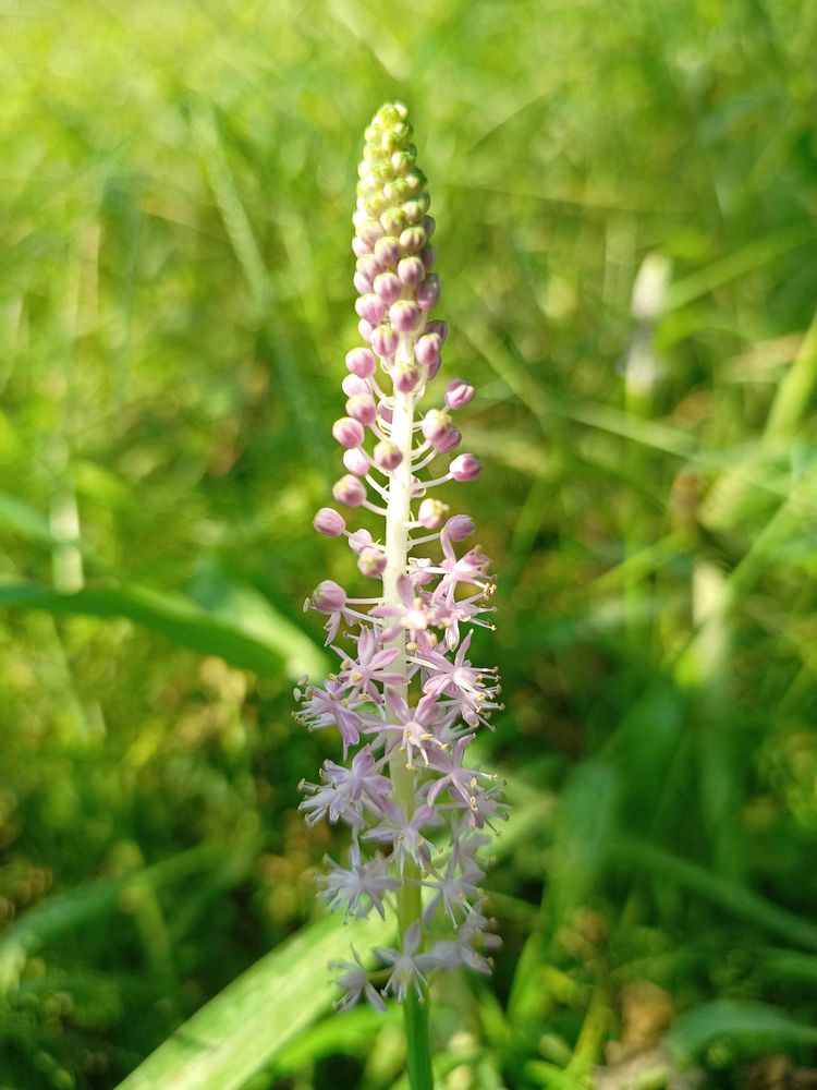 開花は8~9月で、葉の間から伸びた30センチほどの花茎を取り囲むように、直径3~4ミリの小さな淡い紅色の花が咲く。花は下から順に咲き、花茎は開花が進むにつれて上方へ伸びる。花の後には緑色の果実が膨らみ、秋には黒くて艶のある楕円形の種子ができる。