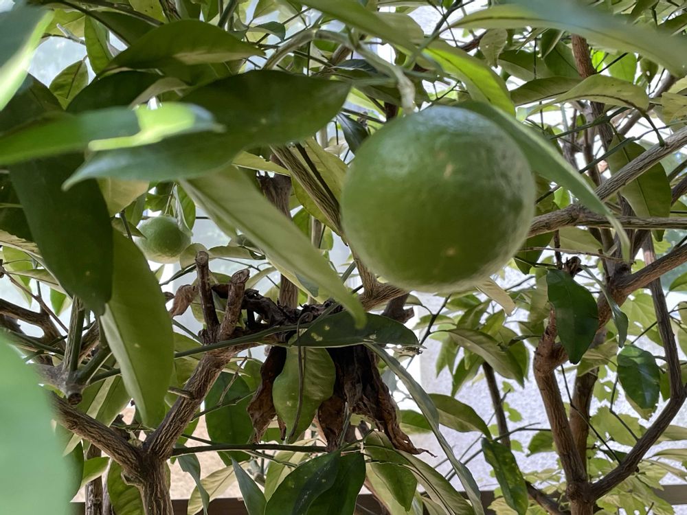 開花した時にAI判定で教えてもらったタチバナの実は今では直径5センチを超えてきました。どうもタチバナでは無さそうですが、柑橘類は間違いなし。