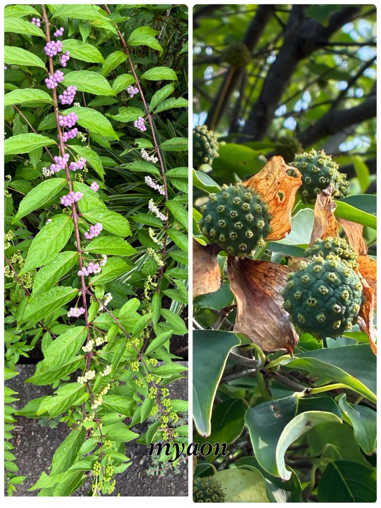 コムラサキ、ヤマボウシ、ヘクソカズラ、ヤブガラシ、カラスウリの実、チャノキ