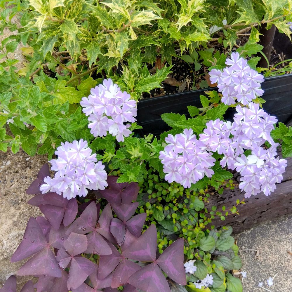 ④バーベナ アイストゥインクル🤍🩵花がらを摘むとまた直ぐに次の蕾達が開花してくれます。ヒイラギを囲むように咲いていて、全体は上手く撮れずです😅