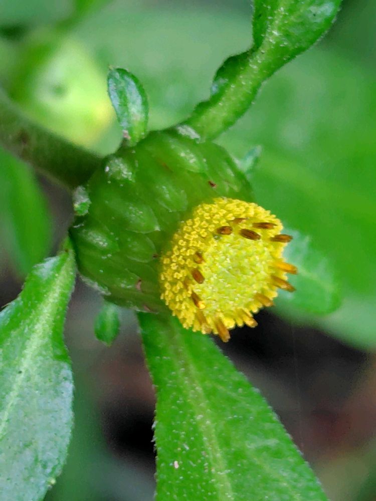 頭花は舌状花を持たずに淡黄色の筒状花を多数持つ。