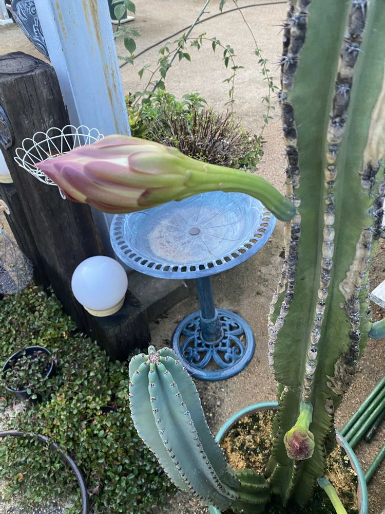 こんばんは!私の柱サボテン 一昨年初めて蕾がついたものの、下の蕾位になるとポロッと落ちてしまって、去年も今年もポロっと落ちてしまいました😨