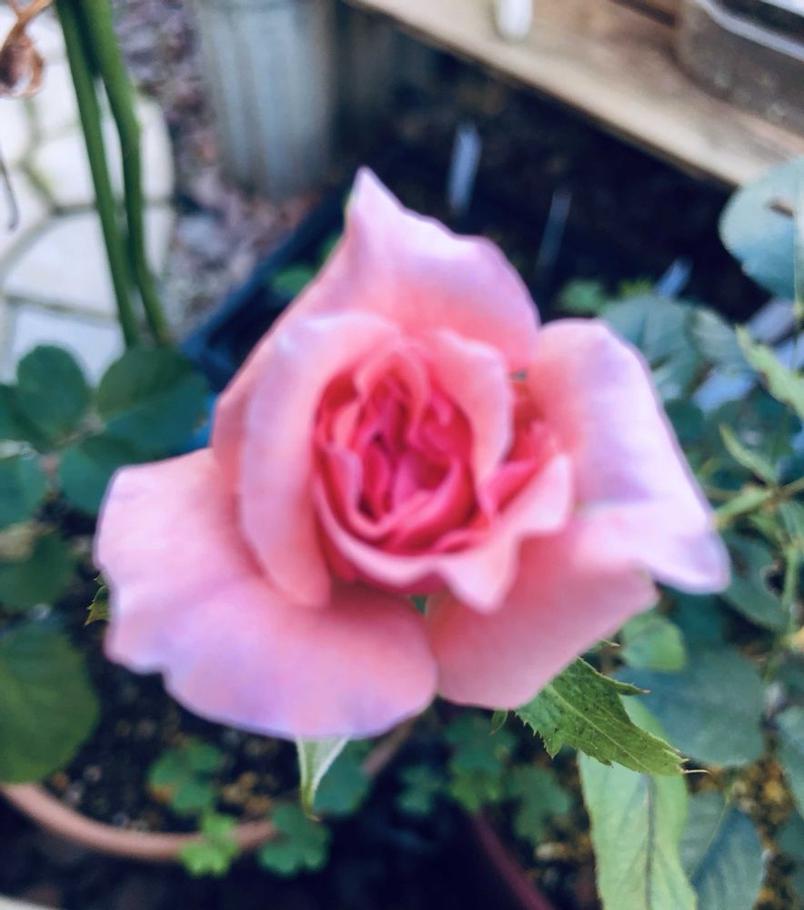 ご近所さんから頂いた切りバラ、挿し木で根付きました。そのバラ今月、また咲きました。😅