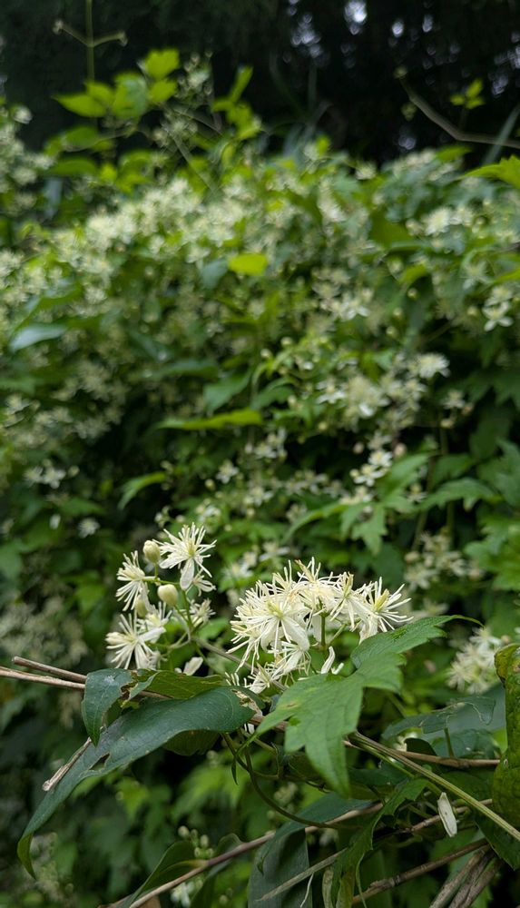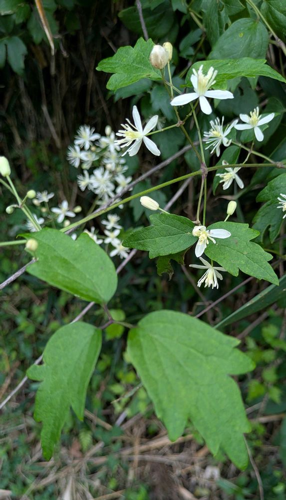 葉はボタンの葉に似て、対生する3出複葉💚 笹だろうが樹木だろうがガードレールだろうが、なんにでも絡みついて、季節外れの雪山を作る゜。 ҉ ☃