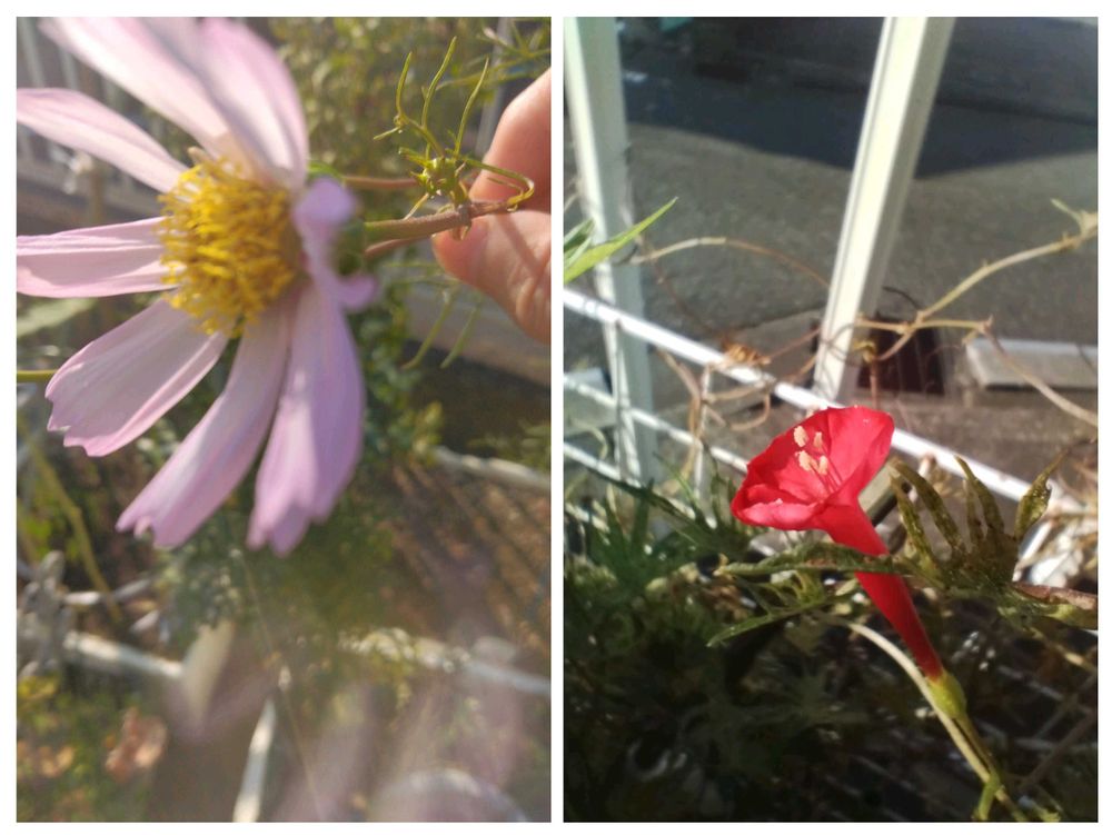 【1】昨夕観察していたらコスモスが咲いてました🤗既に花びらが散る花も見受けられ、この株は元気に育っていた茎も太く背丈も高くて、開花を見逃していた程😂