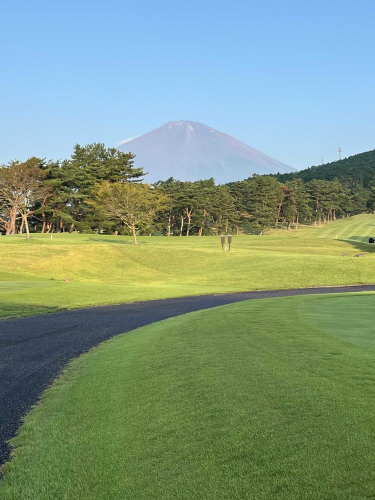 今朝の富士山とゴルフ場、稲刈り前の田んぼ