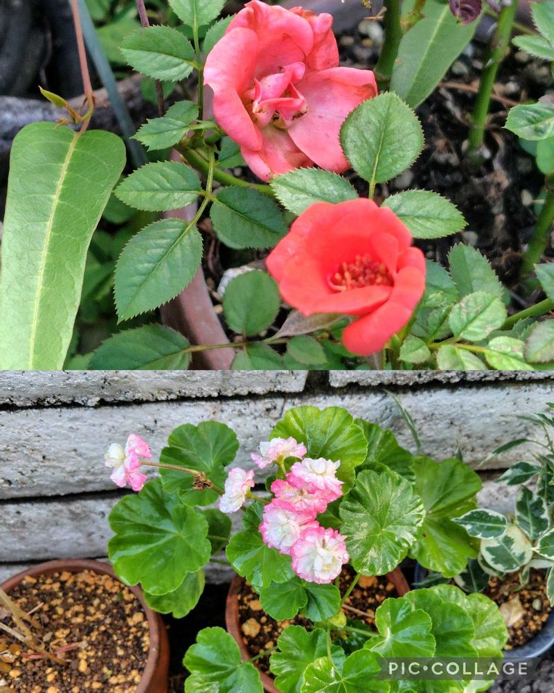 ①オレンジのミニバラとゼラニウム