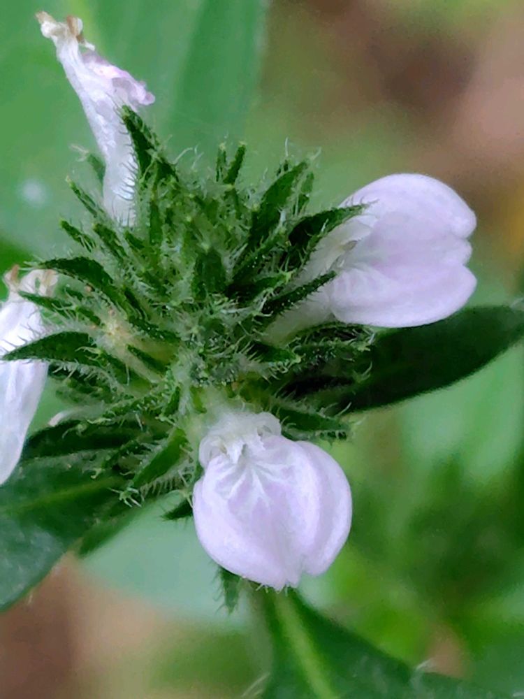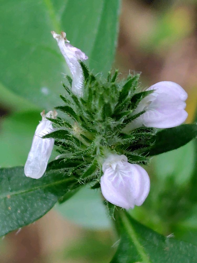 枝の先に穂状の花序を付け、白色の唇形の花を付ける。