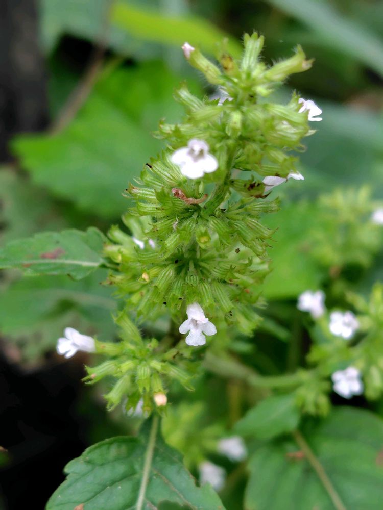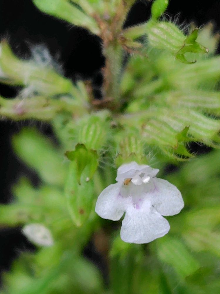 花冠は白色でわずかに淡紫色を帯びる。長さ5〜6mmで上唇は浅く2裂し、下唇は3裂する。