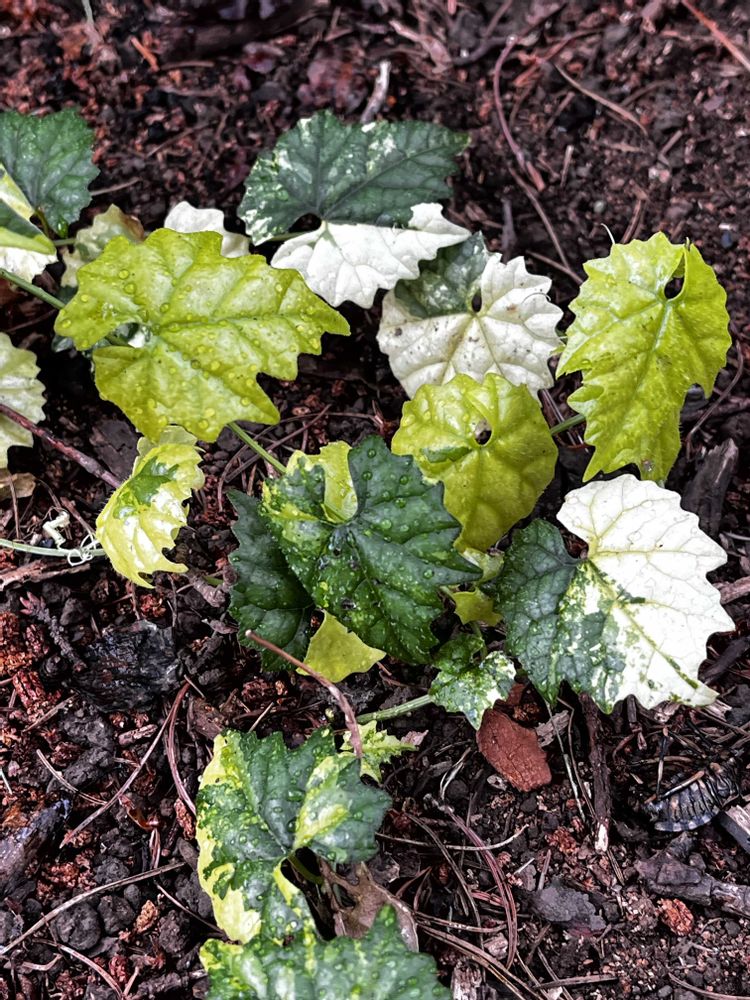 今日は奥地までホースを伸ばし散水、ふと下を見ると、キカラスウリの斑入り株が発生してる😳