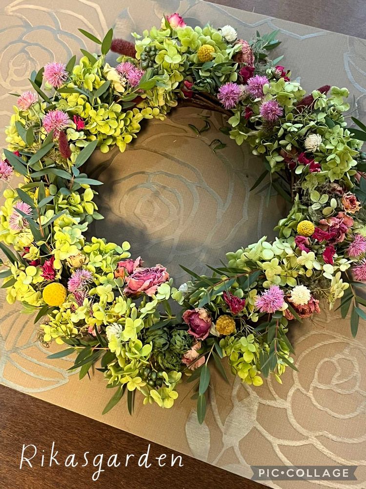 暑い季節は、生花が長持ちしないので、ドライフラワーのリースにしましたよ。
