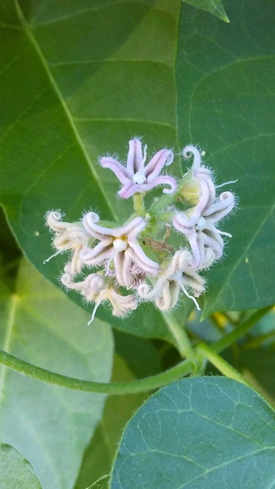 土手から歩道脇の安全柵まで蔓葉を伸ばしたガガイモが 淡紫色と白色の花をひっそりと咲かせていました 一般に花冠は肉質で5裂して星型に反り返り 内側に白い毛が密生するとされていますが 光の当たり加減か外側の毛も目立っています 少々グロテスクな感じもしますが 姿形はあたかも陸に上がったヒトデのようです