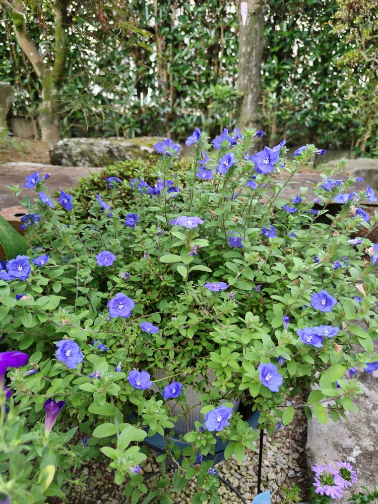エボルブルス・ブルーラグーン💙築山の樹木の陰でわさわさと拡がって咲いています。雨にも猛暑にも負けない元気な子😆