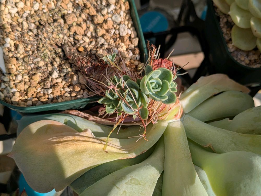 2枚目 3枚目 頭が重く倒れ掛けていましたが 秋までいじるのは良くないそうでそのまま 茎よりのベビーも段々と大きくなって来ています😊