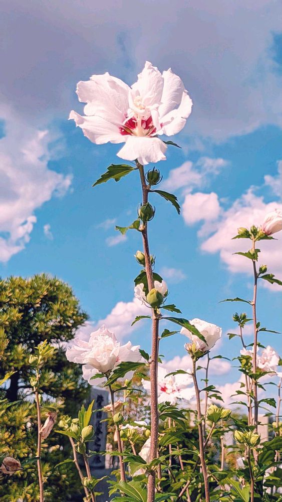 ムクゲが天高く、可愛く背伸びしていますね⤴️