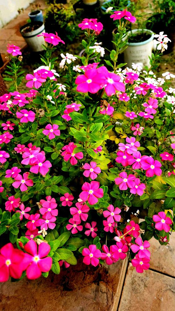 4枚目…“ニチニチソウ”この花は猛暑の夏でも玄関前を彩ってくれる大切なアイテムです。😊