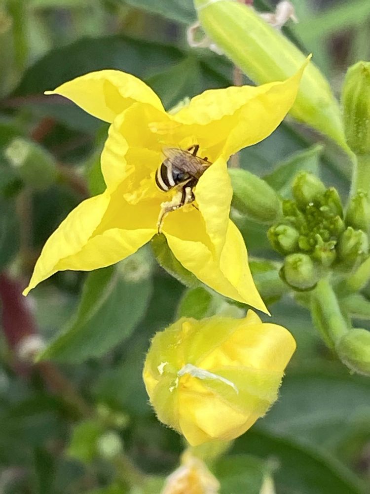 オオマツヨイグサはしぼむところだけど、蜂は待ってくれとばかりに〜🐝