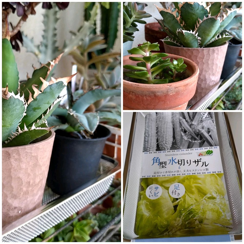 多肉棚の一番上にステンレスざるを置いて落下防止対策しました😉🌱✨そこだけ対策してなかったので、つい先日とうとう素焼き鉢を落として割りました😂💦これでひとまず安心かな😄🌱