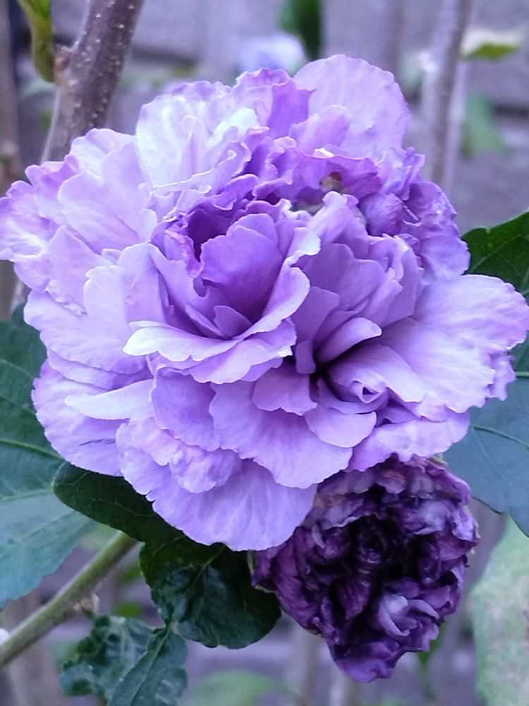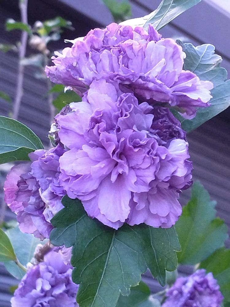 パープルのムクゲ初めてです。八重咲きで豪華ですね。説明がなければ