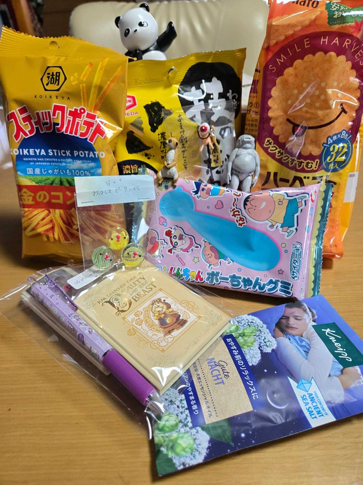 沢山のお菓子とおはじきピータン化、目玉おやじ『祭じゃ』ピック、鯉人🐈⬛釣り日和のガチャ、ディズニーのお土産ペンとメモ帳、バスソルト