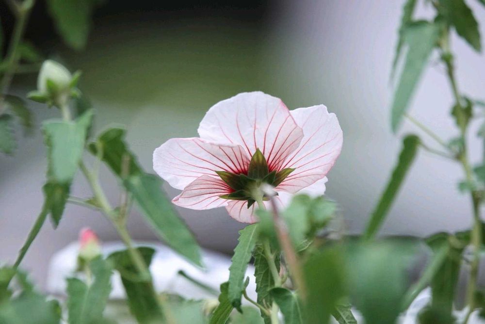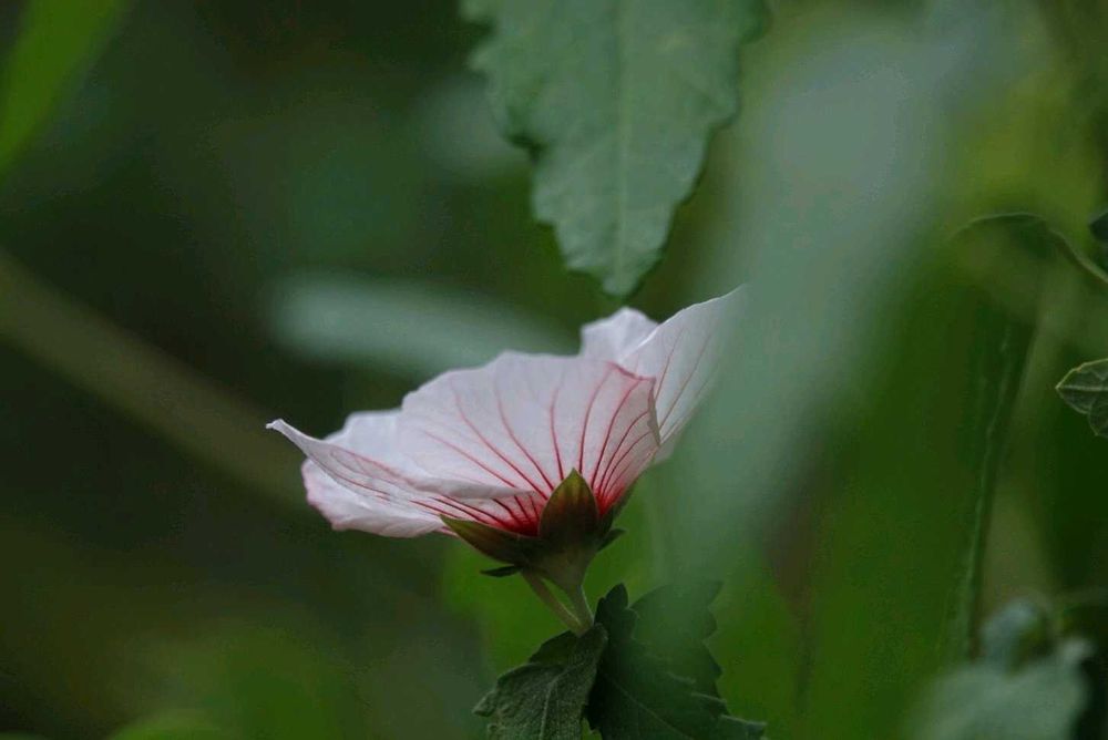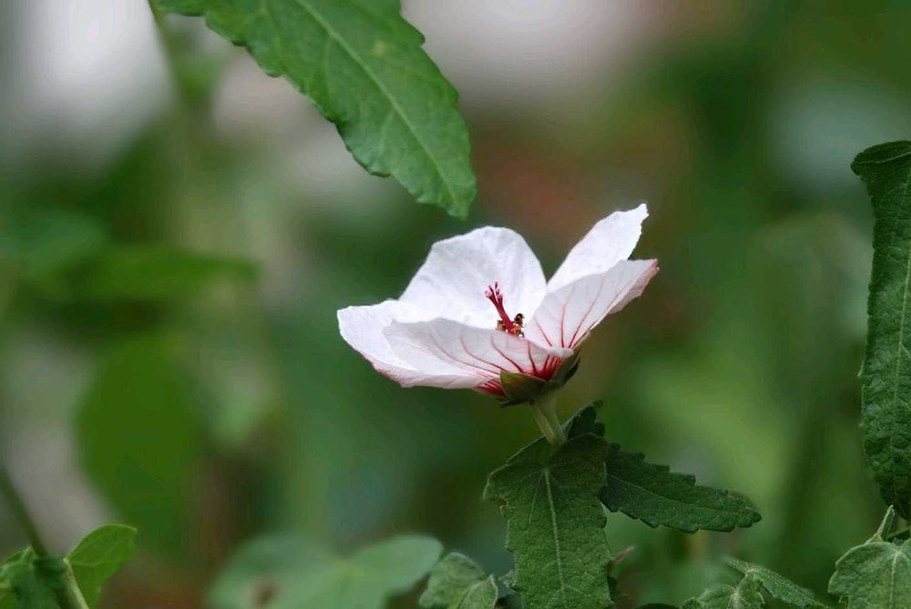 白い花弁は5、中心部が赤色で裏に赤色の筋があ。枝先に一つ花を付ける。葉の縁に波状の鋸歯がある。