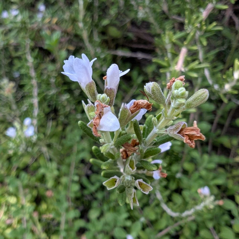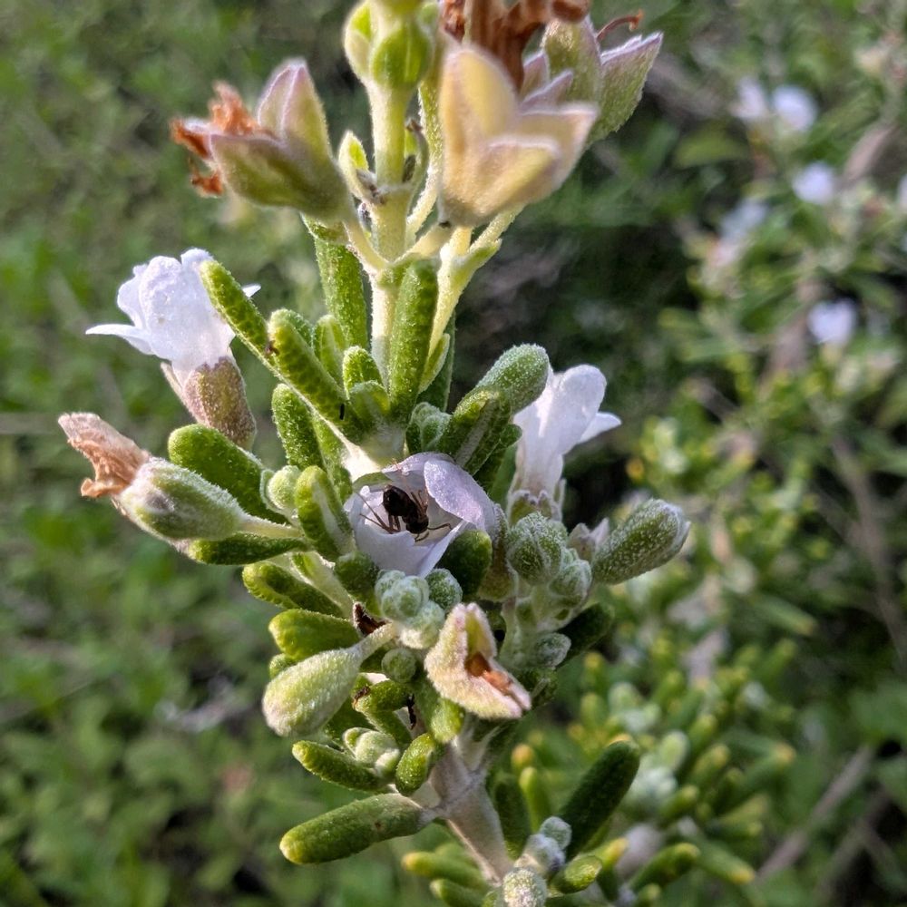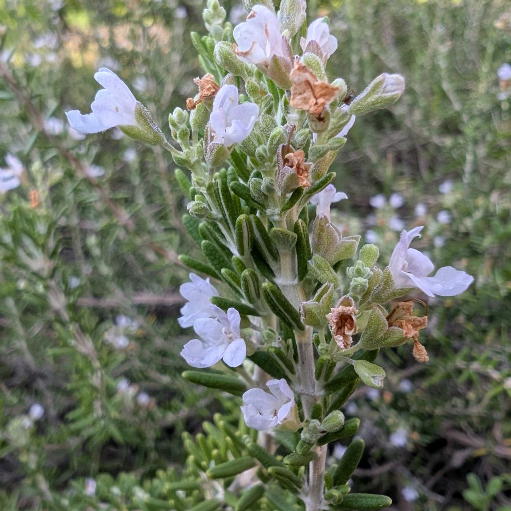 畑でローズマリーが小さな花を咲かせています。