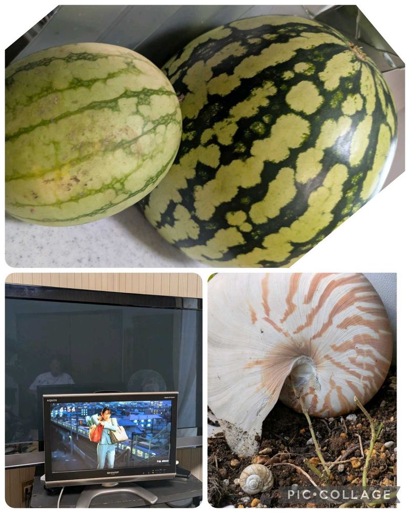 2階片付けしてて、なぜかオウム貝が、出てきて、庭においたら近くに、カタツムリの殻が。