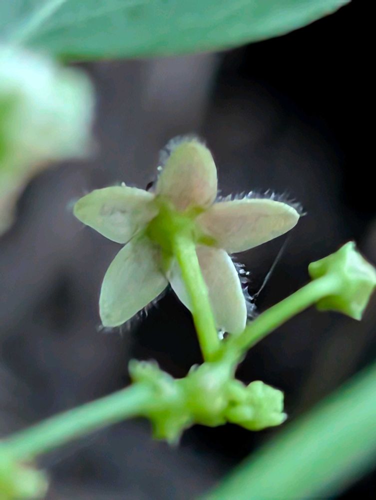花序は小さく葉腋につき、花は淡暗紫色で直径約5㎜。花冠裂片の内面にちぢれ毛がある。