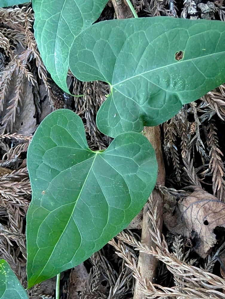 葉は3角状狭卵形で膜質、ほとんど無毛、先は長くとがり、基部は心形。長さ6〜12cm、幅2〜6cm。